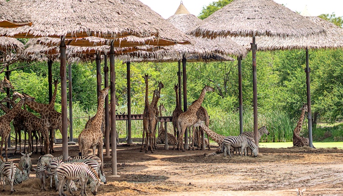 Geniet van een acht kilometer lange doorrij-safari die 45-60 minuten duurt en door zones cirkelt die zijn gemodelleerd naar de Afrikaanse savanne en de Aziatische hooglanden. Je kunt met je eigen voertuig rijden of met een open bus in het park, met voldoende stops om wilde dieren te bekijken.